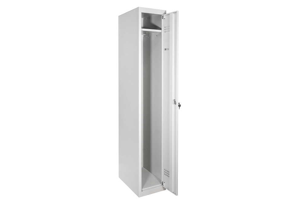 Шкаф металлический для хранения сменной одежды. Распашная дверь оборудована врезным замком и запирается на ключ.Параметры упакованного товара: